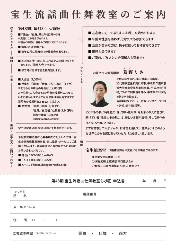 2027年1月より開校いたします、【初心者のための謡曲仕舞教室】第48期の募集を開始いたしました。