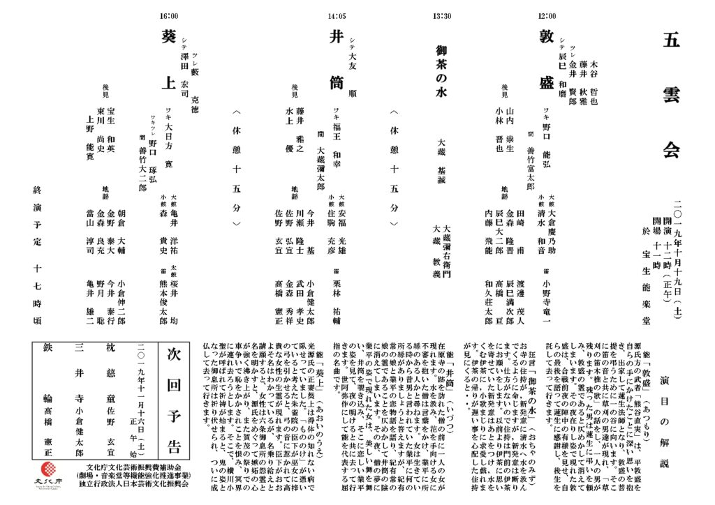 番組は、能「敦盛」シテ 辰巳和磨、能「井筒」シテ 大友順、能「葵上」シテ 澤田宏司 ほか。