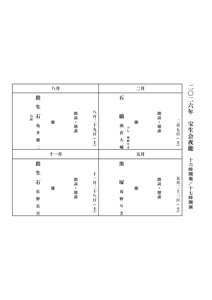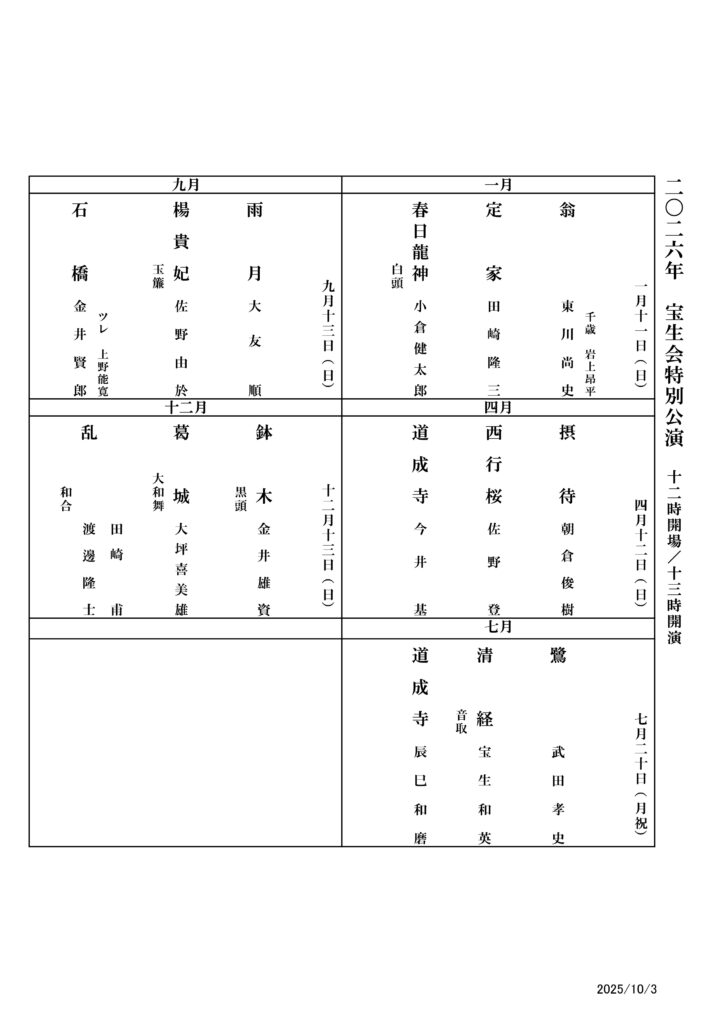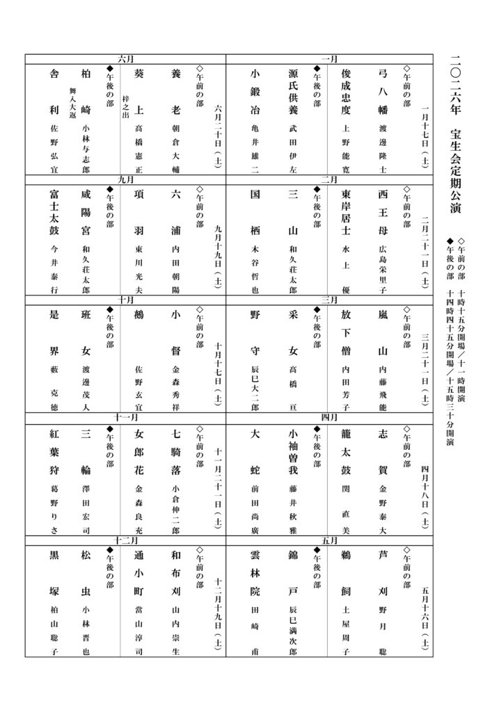 平素は格別のご高配を賜りましてありがとうございます。この度、2026年の宝生会主催公演情報を公開いたしました。来年もより一層のご支援とご協力を賜りますよう、何卒よろしくお願い申し上げます。